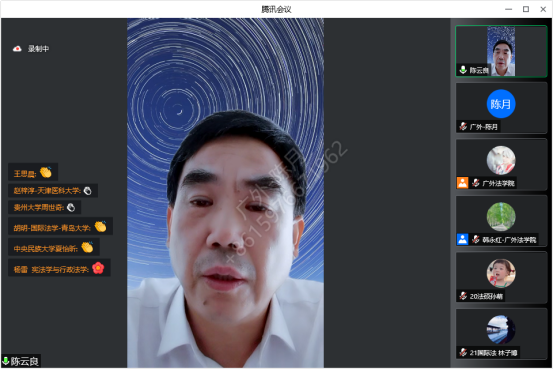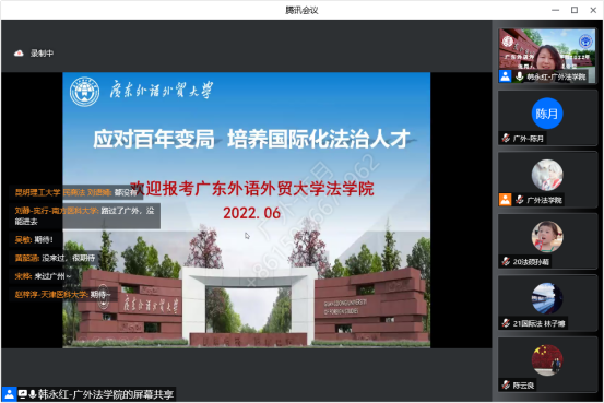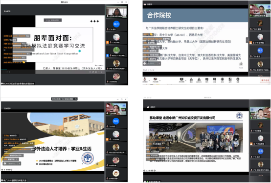 2020级法律硕士(涉外法治人才班)陈春蕙同学分享了“杰赛普”国际法模拟法庭、“贸仲杯”国际商事仲裁模拟仲裁庭辩论赛、法兰克福国际投资模拟仲裁庭等国际模拟法庭竞赛的参赛经历和备赛经验。2020级法律硕士(涉外法治人才班)叶慧敏同学从专业课程、科研创新项目和生活环境等方面介绍了涉外律师和涉外法治人才班的培养特色。2021级国际法林子博同学从留学目的、申请流程、资助政策及个人感悟等方面介绍了广外关于国(境)外留学、访学的申请流程和优势。2020级法律硕士肖镕同学介绍了知识城校区研究生们的社会实习、实践活动以及系列文体活动。