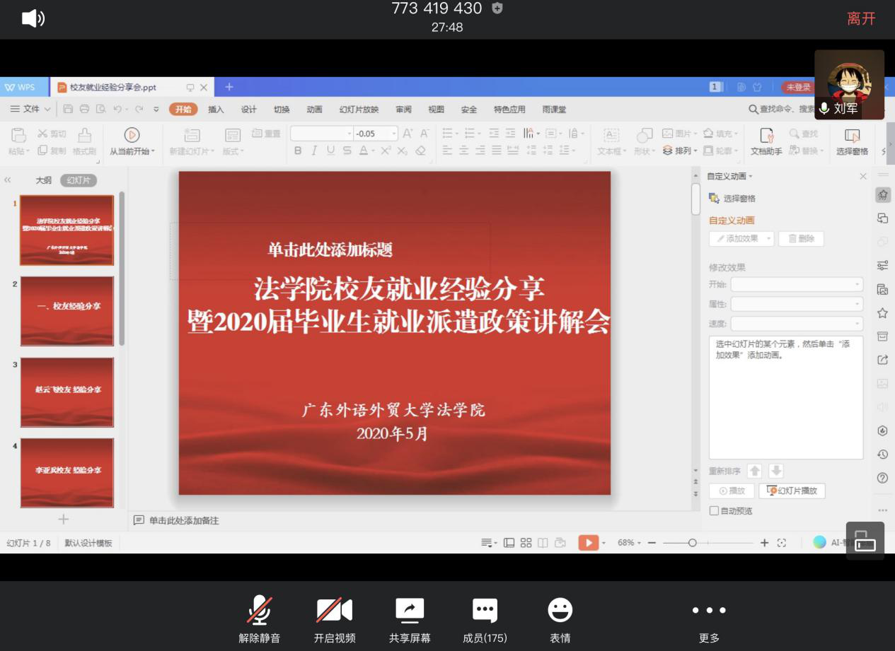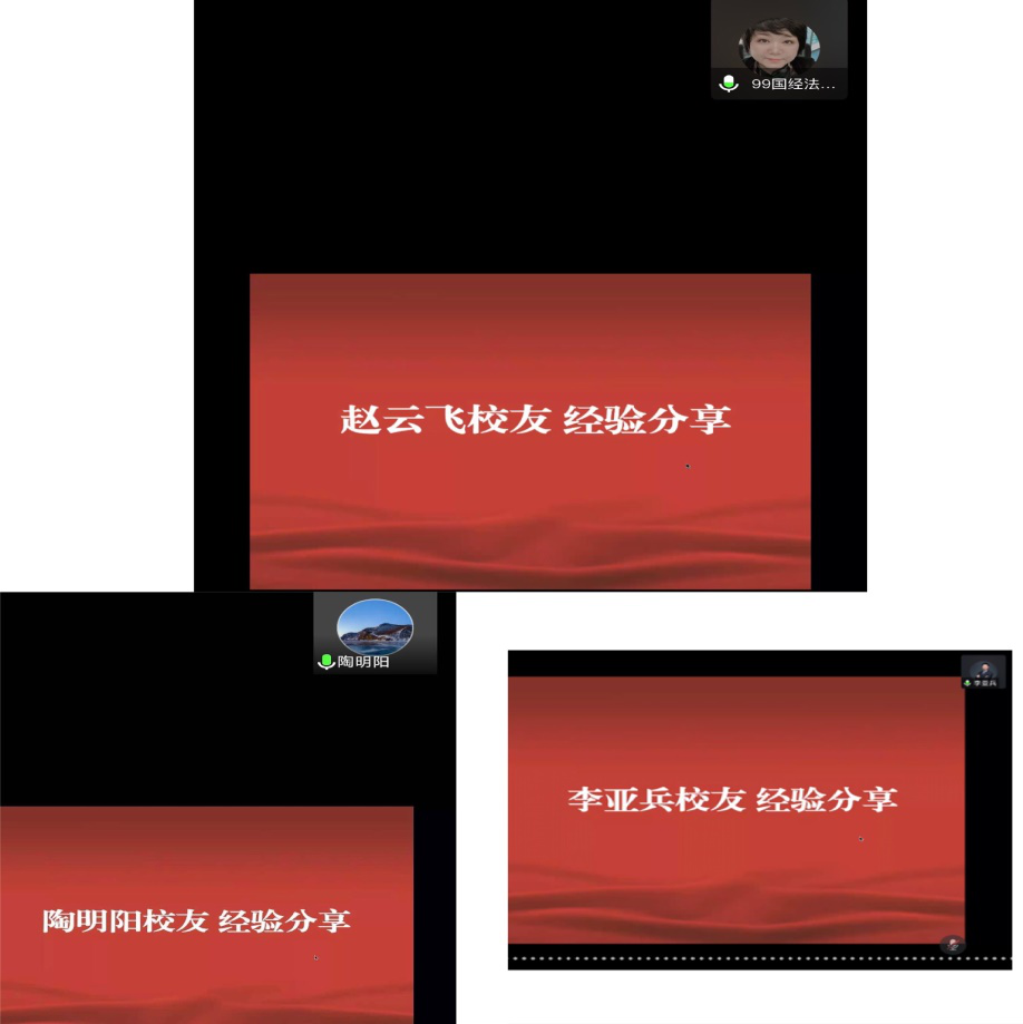 员工就业经验分享环节,三位员工结合丰富的工作经历,与同学们分享就业经验。赵云飞员工对毕业生提出三点建议:第一,要夯实专业基础、提高法律专业技能。疫情防控背景下,就业形势异常严峻,应注意利用好应届生身份,树立“先就业再择业”的正确就业观。第二,具体求职方面,建议同学们以发展的眼光看问题,找工作不局限于法律相关工作,要勇于尝试其他类型的职业。在了解求职单位和相关行业背景的基础上,应注意广投简历。第三,职场中注重积累工作经验,有利于提升人际交往和沟通能力。陶明阳员工建议毕业生积极调整心态,从容面对“有法律相伴的人生与工作”及“未直接与法律相关的工作”。他鼓励毕业生主动出击,结合自身兴趣寻求工作机会。毕业求职季,尽快转变身份、融入社会,在实际工作中不断增强自身实力,提高各方面技能,为未来发展奠定坚实基础。实际工作中,遇到困难多与员工联系、多向员工请教,寻求师兄师姐的帮助。李亚兵员工则结合个人实际,分享了求职经历和求职过程中的自身感受。他认为,职业生涯发展并非一蹴而就,每一段经历都是人生的宝贵财富。迷茫焦虑时,不要自怨自艾,接受自己,多进行积极的自我心理暗示。勇敢地拥抱未知,不怕犯错误。做出选择后,不徘徊,低头默默耕耘,用心做好手头每一件小事。偶尔抬头看路,审视自己前行的方向;时常与内心对话,听听自己内心的声音。