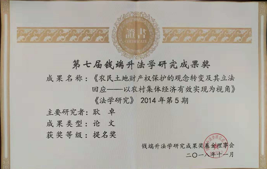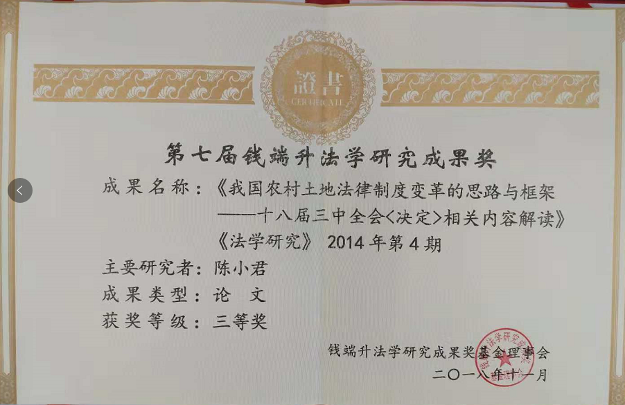 11月25日, 第七届钱端升法学研究成果奖颁奖大会在北京举行。公司陈小君教授的论文《我国农村土地法律制度变革的思路与框架——十八届三中全会<决定>相关内容解读》荣获三等奖,耿卓教授的论文《农民土地财产权保护的观念转变及其立法回应——以农村集体经济有效实现为视角》荣获提名奖。这两篇均是近年发表在《法学研究》期刊上的论文。该奖每两年颁发一次,陈小君领衔的团队曾荣获2008年第二届钱端升法学研究成果奖三等奖,2014年第五届钱端升法学研究成果奖二等奖,今年是该团队第三次获奖。
