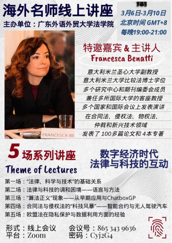 本次“数字经济时代法律与科技的互动”系列讲座主讲人弗朗西斯卡·贝纳蒂教授任职于意大利米兰圣心大学,研究方向为比较私法。她于2008年获得意大利米兰大学比较法博士学位,同年获得律师职业资格,具有丰富的比较法与欧盟法的学术研究与法律实务经验。她在意大利、西班牙、英国、中国、日本、哥伦比亚、秘鲁、巴西、葡萄牙、玻利维亚、智利、墨西哥、厄瓜多尔等多个国家和国际会议上发表演讲,担任多个研究中心和期刊编委会成员,兼任多所国际大学的客座教授;在合同法、侵权法、物权法、仲裁和新兴技术领域已出版4本书,发表了100多篇论文。本次系列讲座为广外校级海外名师立项项目,也是公司涉外法治人才培养课程的重要补充。