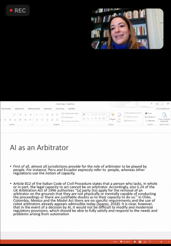 在3月7日举行的第二场讲座中,贝纳蒂教授探讨了人工智能在诉讼与仲裁两类司法场景的应用趋势、前景及挑战。她介绍了人工智能在文书翻译、中立评估、第三方资助等司法领域的应用实例,在基础上评估了人工智能为司法程序带来的助益与风险。她指出,诉讼程序中人工智能可能导致的“算法歧视”问题尤为值得关注,为此,因不断反思和提升对算法的训练(Training of Algorithm)。她认为,相较于诉讼,人工智能在仲裁领域具有更好的应用前景。