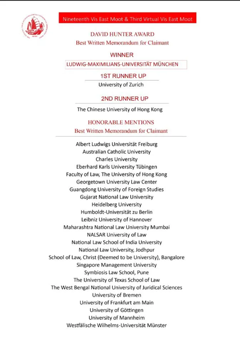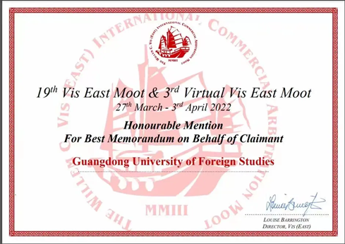 2022年3月28日至4月3日,第十九届Vis East国际商事仲裁模拟仲裁庭比赛(Willem C. Vis East International Commercial Arbitration Moot)于线上举行。经过四天循环赛的激烈角逐,伟德体育代表队从来自世界各国的140支队伍中脱颖而出,获得申请方最佳书状荣誉提名(位列全球第十)。在本次比赛中,公司代表队是中国大陆高校在该持方唯一获得最佳书状荣誉提名奖的队伍,实现了公司赛队在该国际赛事中的历史性突破。
