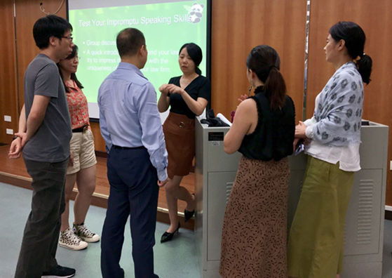 紧接着,王欣老师组织学员们以就如何提升个人即兴演讲能力为主题进行分组讨论,学员们迅速组成小组,积极地用英语分享自己在涉外业务中的经历和相关经验。分享交流结束后,王老师再次邀请学员轮流上台以执业经历为主题进行全英即兴演讲。