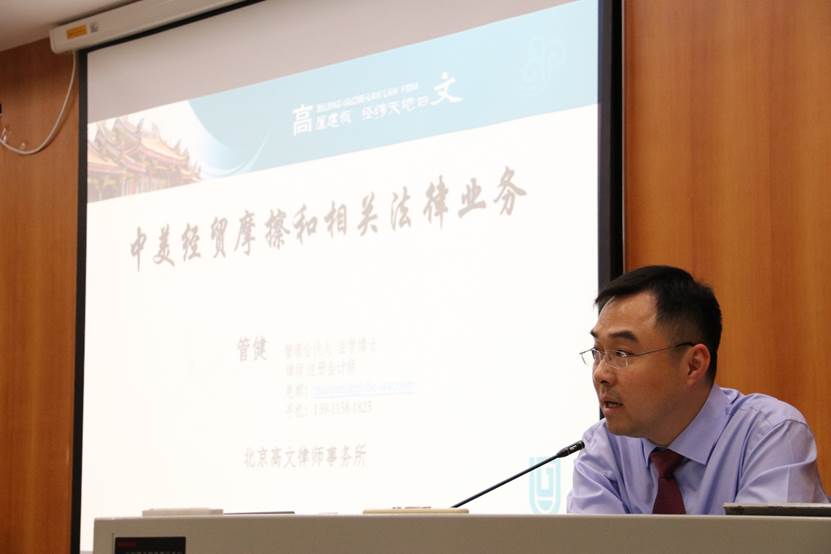 北京高文律师事务所管理合伙人,司法部“全国千名涉外律师人才”,全国律师协会涉外律师领军人才,商务部律师事务所库入库律师管健博士,为学员们讲授《中美经贸摩擦中的法律问题》。管健博士从中美经贸摩擦的形式、中美谈判和第一阶段协议、中美四个维度的冲突以及中美经贸摩擦的相关法律业务等四个方面全面深入地讲解了中美经贸摩擦的问题。