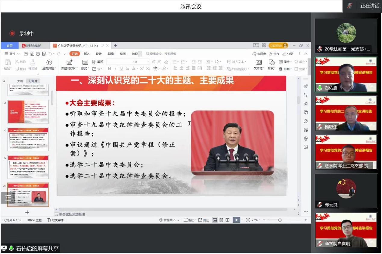 石佑启寄语教师党支部和思政课教师,深刻领会习近平总书记提出的“五个牢牢把握”重要要求,学深悟透党的二十大精神核心要义、实践要求,紧紧围绕立德树人根本任务,坚持不懈用习近平新时代中国特色社会主义思想武装头脑、指导实践、推动工作,引导教师争做新时代的“四有”好教师,当好“四个引路人”,培养“大国良师”。他勉励员工党支部和员工社团成员筑牢理想信念之基,全面系统学习好党的二十大精神,始终与党同心,坚定跟党奋斗,不负韶华,不负时代,心怀“国之大者”,践行“卓越、诚信、包容、自信”的广外价值观,弘扬“进德、修业、务实、致远”的广外学风,矢志奋斗,砥砺前行,努力做“眼中有光”“脚下有路”“肩上有责”“心中有德”的新时代广外人。