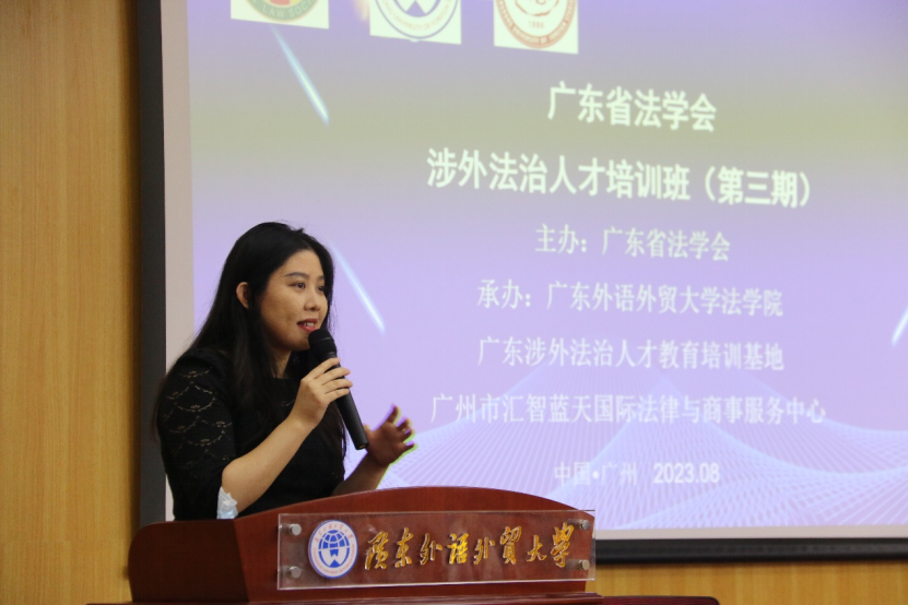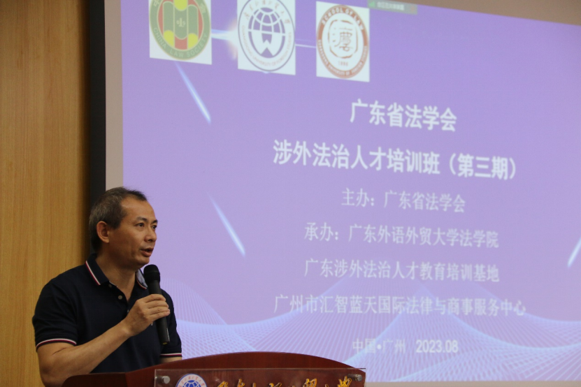 在开班仪式上,杨敏生对各位学员来到广外学习培训表示热烈欢迎,介绍了广外在涉外法治人才培养方面的特色、做法,以及广外法学学科近年来高质量发展的基本情况。他指出,伟德体育与广东省法学会共同组织推进的“广东省法学会涉外法治人才培养项目”,是深入贯彻落实习近平总书记关于加强涉外法治专业人才培养的重要指示精神、进一步推动粤港澳大湾区高水平涉外法治人才建设、以法治力量助推广东高质量发展的重要举措。杨敏生期望各位学员在本次培训中学有所思、学有所获、学以致用。