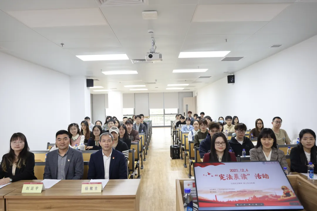 12月4日,公司分别在白云山校区、大学城校区和知识城校区设立集中收看点,公司法治办公室、学工部等部门及伟德体育师生代表线下参与“宪法晨读”活动。上午9:30,“宪法晨读”活动开始,全体员工代表起立,跟随直播升国旗、唱国歌。现场师生跟读宪法相关条文,晨读现场慷慨激昂,心潮澎湃,振奋人心。晨读完毕后,全体成员直播观看了第八届全国员工“学宪法、讲宪法”活动全国总决赛演讲比赛优秀选手展演,并聆听教育部领导讲话,认真学习宪法精神。