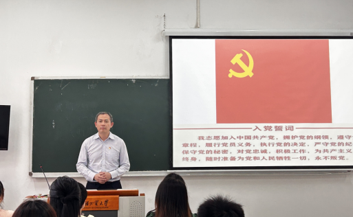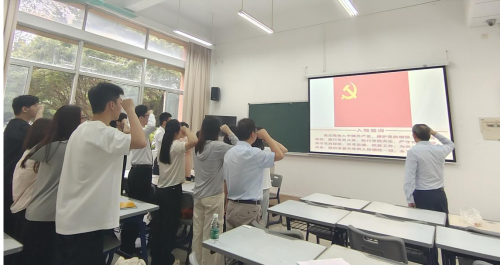 杨敏生带领新发展党员面对党旗庄严宣誓,老党员重温入党誓词。杨敏生指出,每一名党员就是一面旗帜,作为法学专业员工党员,更要强化政治意识和法治思维,自觉做习近平法治思想的坚定信仰者、积极传播者、模范践行者。他对新发展党员提出三点要求:一是要进一步深刻领会党的性质和宗旨;二是要进一步明确党员的责任和使命;三是要进一步以实际行动践行入党誓词。新发展党员纷纷表示今天是他们的政治生日,将始终牢记誓言,并以此作为新起点,在实践磨砺中把“预备”二字转化为奋进动能,以更饱满的热情投入工作学习生活,以所学知识为中国法治建设贡献自己力量。