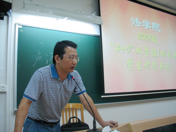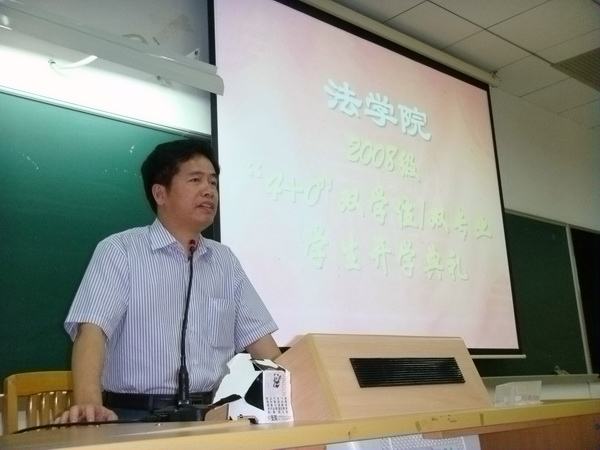 晚上6点,典礼正式开始。首先,蔡镇顺经理上台发表了讲话。对在场双学位报读法学的同学表示热烈的欢迎,他详细地为同学们分析了法治与社会发展的关系,并强调了作为一个法律人应尽的社会责任以及当前普法工作的紧迫性等问题。