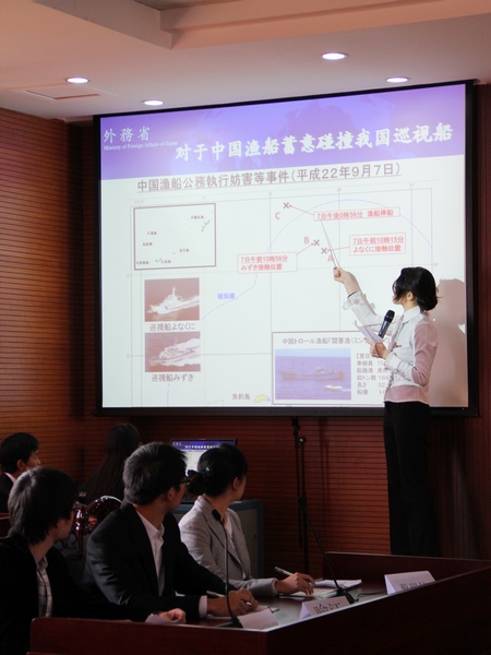 此次论坛首开角色扮演发言形式的先河,中大代表队,暨大代表队分别代表美国国务卿助理和日本外交部发言人,而作为东道主的广外代表队则代表中国外交部。三方齐聚,对关于钓鱼岛的问题各抒己见。首先是各代表队按照之前抽签的次序进行发言,发言环节考验的是选手们驾驭外交语言以及相关外事礼仪的能力,还有准备工作的深入程度。在每次代表队发言之后,是其他两个代表队和观众以及嘉宾的盘问时间,唇枪舌战,考量选手的应变能力。广外队率先登台,从国际法和史实出发,严申中国对钓鱼岛具有一贯的坚定立场和不可分割的主权。而中大代表队所代表的美国则强调了其从民主、和平、自由出发的对华关系立场,最后由暨大代表队扮演的日方代表表示,希望冷静严肃地处理这个问题,实现战略互惠。各方选手互不相让。评委和观众的提问同样具有强烈的针对性,选手们应答如流,正如专家点评的那样,本次论坛的选手们准备充足,应变能力强。