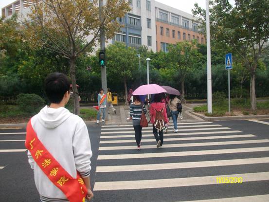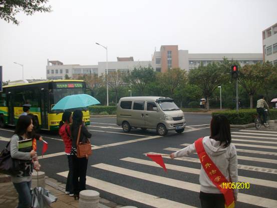 这一幕就发生在公司大学城校区生活区通往教学区的路口,细心的人们会发现,最近,在旭日初升的清晨,同学们匆匆赶往上课时;在艳阳高照的中午,同学们携伴前往用餐时;在夕阳西沉的傍晚,同学们结束一天的学习时,有这样几位同学站在自己的岗位上,观察来车,用手中的指挥旗引导同学横穿马路,并耐心、有礼的去劝阻试图不按交通灯指示贪一时之快的同学。他们就是由公司伟德体育员工党员组成的亚运交通志愿服务队。