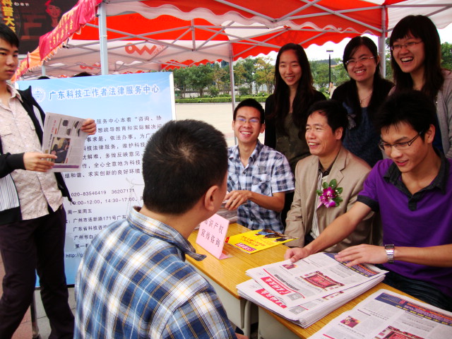 除了提供法律咨询服务,同学们还以真诚服务的态度为会场人员分发科技报和法律咨询指南。