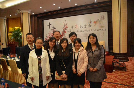 王树春副经理、卢海清副书记、范洪颖老师与广外代表队在钓鱼台大酒店决赛现场