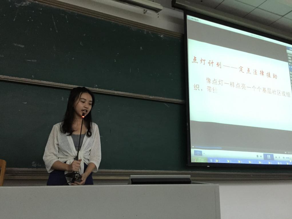 评优大会上,广外法援现任主管黄梓蓉就“点灯计划”定点法律援助项目的内容及意义进行了展示。“点灯计划”定点法律援助项目是广外法援于2014年开始的对外项目,通过主动联系校外基层组织及法律机构,为基层社区的居民提供法律咨询、普法摆摊、专题法律讲座,或为社区受矫人员提供社区矫正课程。广外法援希望通过上述的对外活动,使得更多的群众学会知法守法用法。