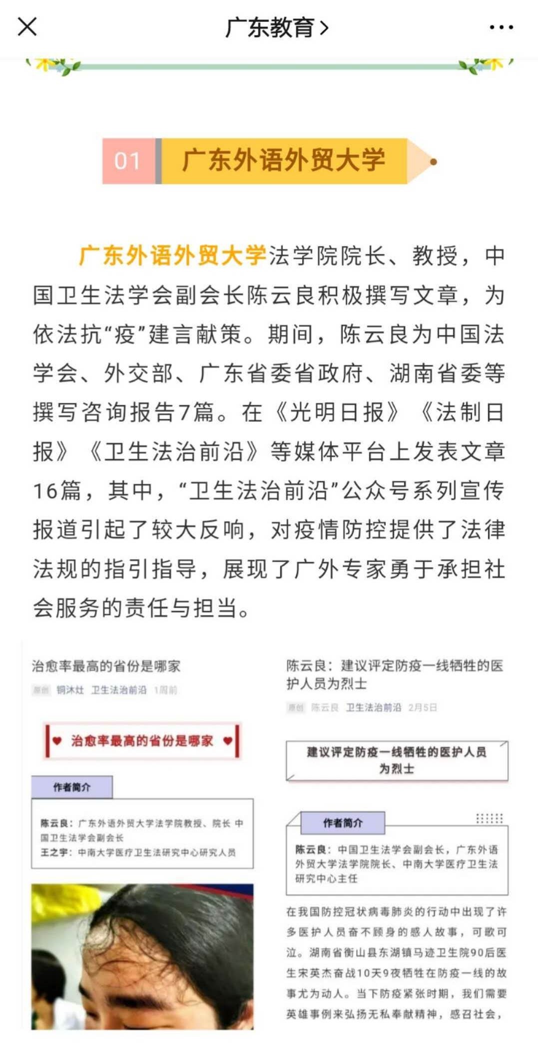 公司经理陈云良教授积极为依法抗“疫”建言献策,多篇文章在《光明日报》《法制日报》《卫生法治前沿》等媒体平台上发表,对疫情防控提供了有效的法律法规的指引指导;区域一体化法治研究中心教授杨治坤接受广东广播电视台珠江频道《法案追踪》采访,针对复工复产返校等问题畅谈“知法守法 共抗疫情”;教授朱最新,讲师谢宇、范雪珂等也在媒体发表依法疫情防控文章。
