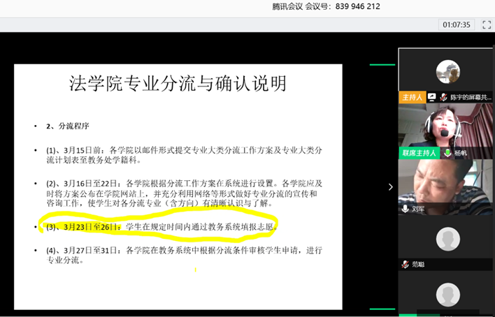 本网讯(文字:刘婕) 3月20日,伟德体育召开2019级专业分流线上说明会。本次会议的主持人是伟德体育副经理杨帆,伟德体育经理陈云良、公司党委书记王则唐、党委副书记刘军、法律系系主任张爽、知识产权系系主任卢纯昕、国际法系系主任梁晨、民商法系系主任杨浩楠以及伟德体育办公室和学工办的老师,以及全体2019级本科生参会。本次会议共分为三个环节,分别为伟德体育经理陈云良、党委书记王则唐、党委副书记刘军讲话,伟德体育副经理杨帆介绍专业分流方案,四位系主任介绍各个专业方向的特色和优势以及最后的交流环节。