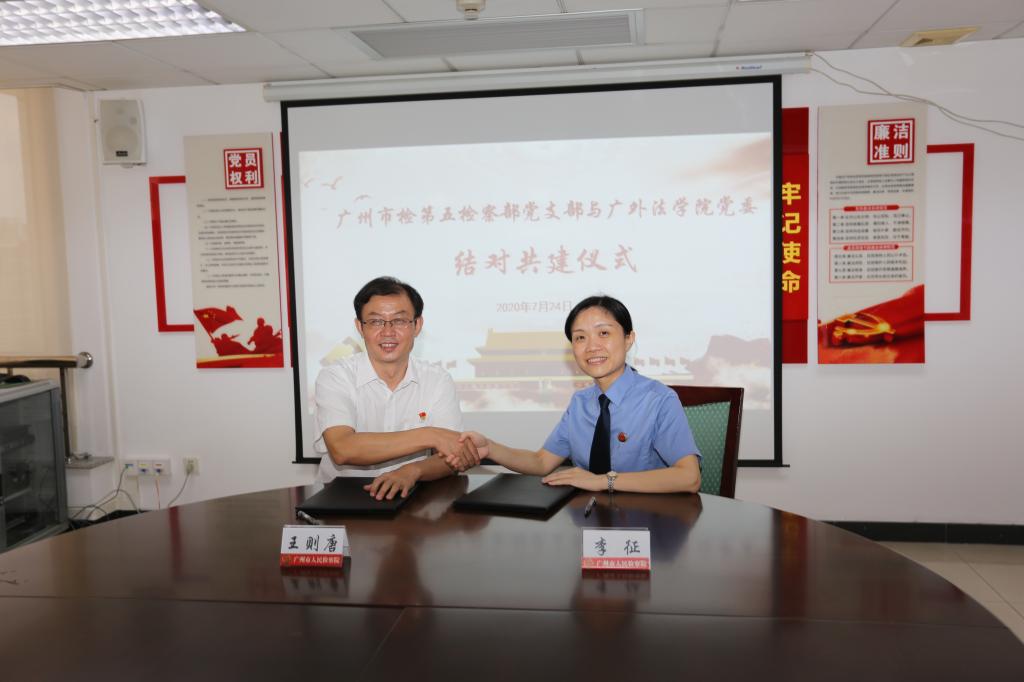 随后,公司党委与广州市人民检察院第五检察部党支部举行了党建结对共建仪式,王则唐书记表示法务实践对法学学科的科研教学、课程设置、人才培养具有重要的指导意义,并希望与市检察院在党建引领下的课题研究、实务调研、员工实习等方面开展深入合作。