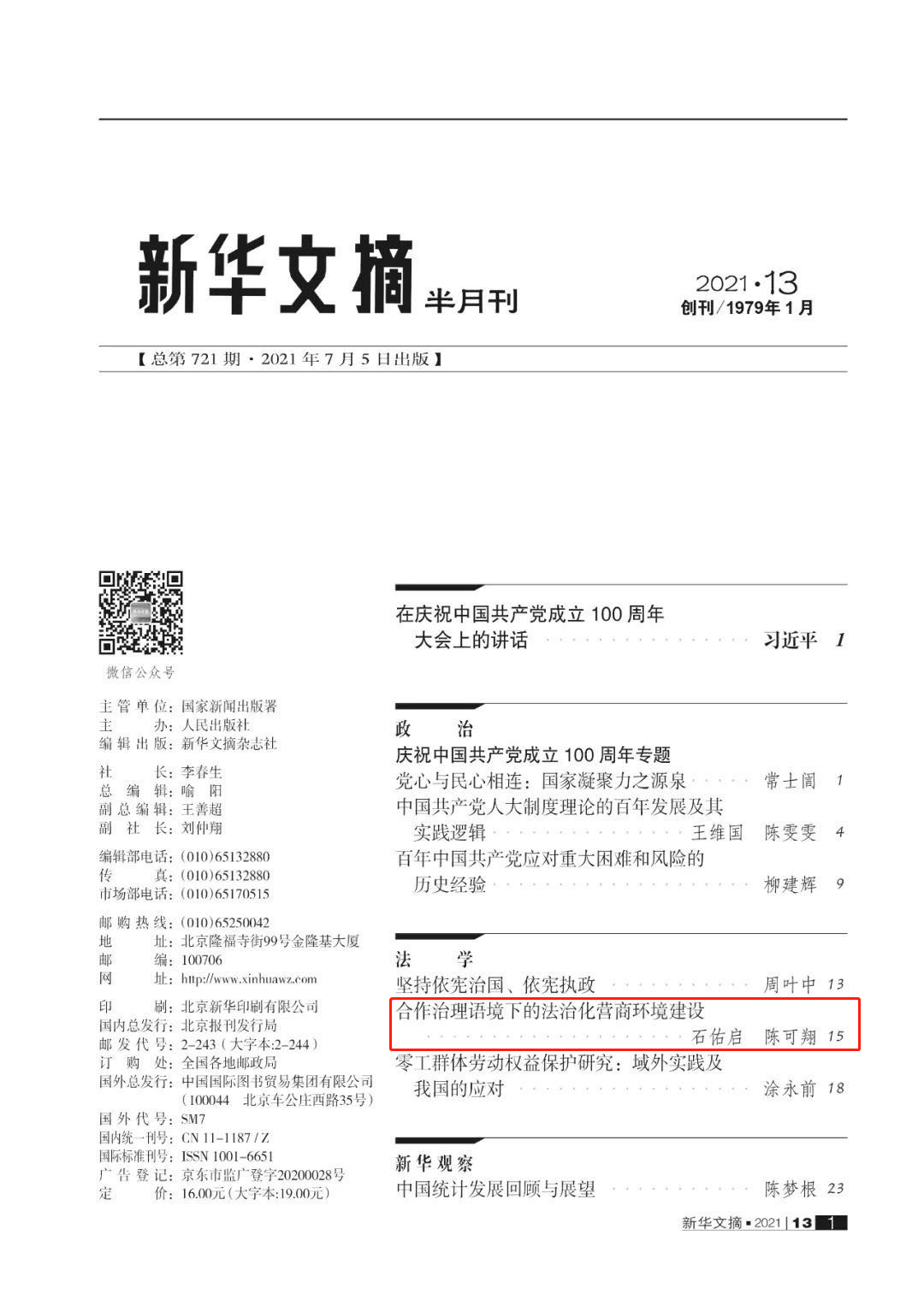 广外法学石佑启教授、陈可翔博士《合作治理语境下的法治化营商环境建设》一文被《新华文摘》2021年13期全文转载,本文原载于《法学研究》2021年第2期第174-192页。