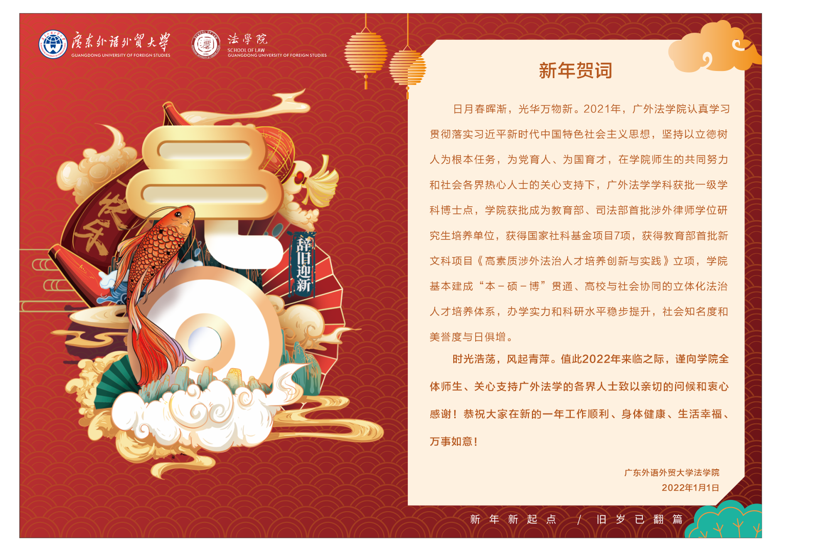时光浩荡,风起青萍。值此2022年来临之际,谨向公司全体师生、关心支持广外法学的各界人士致以亲切的问候和衷心感谢!恭祝大家在新的一年工作顺利、身体健康、生活幸福、万事如意!