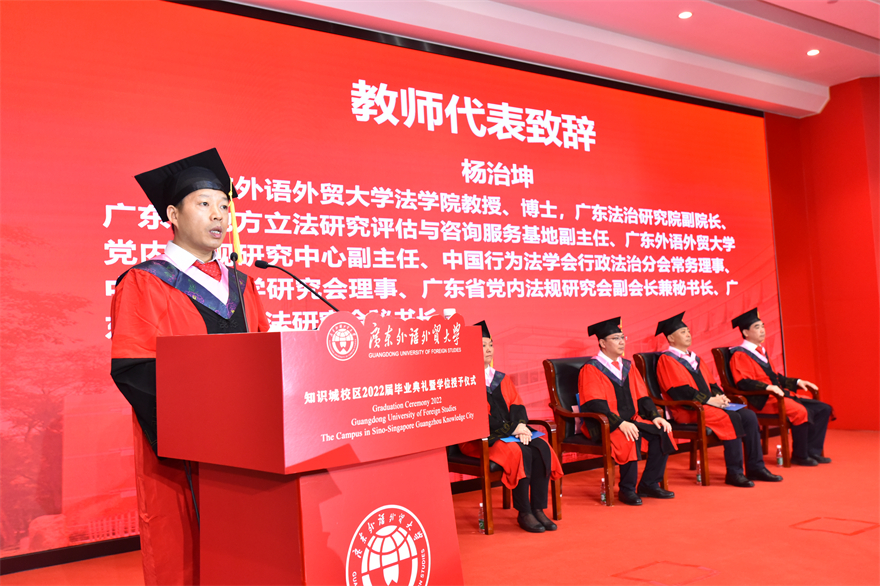 刘海春带领毕业生们回顾了知识城校区两年来的建设发展成就,勉励毕业生们积极投身时代浪潮,肩负青年责任勇担时代使命。刘海春强调,投身时代浪潮,要做知行合一的践行者。他结合公司高级翻译公司口译专业蔡煜琳投身研究生支教团的奋斗事迹,说明要将专业积累应用于实践,创造更多更大价值。希望同学们将在广外的所学所思所悟应用到实践中去,以实际行动展现广外人“行胜于言、担当奉献”的价值追求。投身时代浪潮,要做识变应变的创新者。他援引公司员工曾德祥创办公司等事迹,说明要善于抢抓机遇、勇于超越创新。他希望同学们以他们为榜样,主动识变,积极应变,敢于创新,在激荡的时代中抢抓机遇、赢得未来。投身时代浪潮,要做诚信自律的示范者。他勉励同学们牢记并践行“卓越、诚信、包容、自信”的广外价值观,心存敬畏,明德修身,自重自爱,勇毅前行。