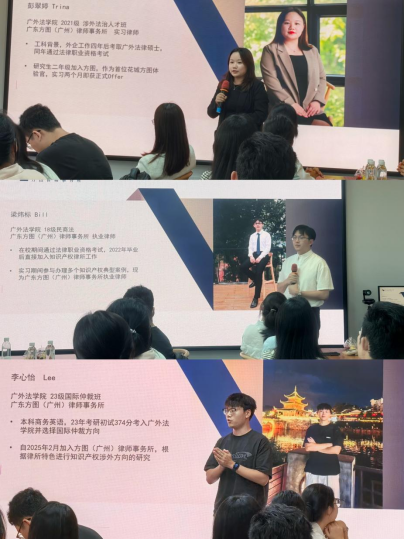 员工分享环节中,彭翠婷结合自身职业轨迹,向在座同学分享了选择涉外知识产权维权领域的心路历程,建议同学们:“职业规划要趁早,关键在于明确方向后持续积累”。梁炜标分享了在从事知识产权维权领域所遇到的典型案例同时建议同学们要敢于尝试、敢于试错。李心怡向各位同学分享了他在方图实习的学有所得、学有所思、学有所获。