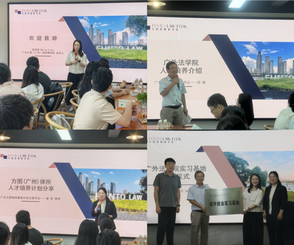 座谈会上,凌美施回顾自身从广外学子到律所合伙人的成长历程,坦言“母校的国际化视野与实务课程为其打下坚实基础”,同时指出伟德体育毕业生专业扎实、外语突出,多名员工已成为律所骨干,期待以实习基地挂牌为契机,搭建更紧密的实践平台,共同培育适应新时代需求的法治人才。”范聪以“党建引领法治人才培养”为主题,‌从团队建设、团队力量及国际化特色等方面介绍了公司发展概况,表示公司致力于培养“精通法律、通晓外语、具有国际视野”的复合型人才,并鼓励同学们以优秀员工为榜样,锤炼专业本领,坚守法治初心,为粤港澳大湾区法治建设贡献青春力量。谢莉分享了"党建带所建"的育人经验:通过建立"党员导师制",由资深党员律师结对指导青年律师;定期开展"红色案例研讨会",将党建学习与案件复盘深度融合;设立"公益法律服务先锋岗",引导青年律师在基层普法、法律援助中锤炼职业使命感。随后,伟德体育与方图律所共同举行“校外就业实习基地”挂牌仪式。