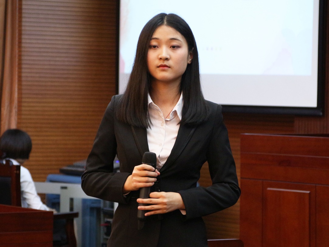 紧接着16政治学二班的林艾诗展示了自己丰富的对外交流经验,对自己有清晰的自我认知。她计划充分利用公司的语言优势,追求目标职业,从事外交方面的工作;她也对目标职业分析和就业前景进行了展示。在嘉宾提问环节中,评委要求林艾诗模拟外交部发言人,评价韩国部署萨德事件。林艾诗从容不迫的临场表现得到了评委的一致好评。