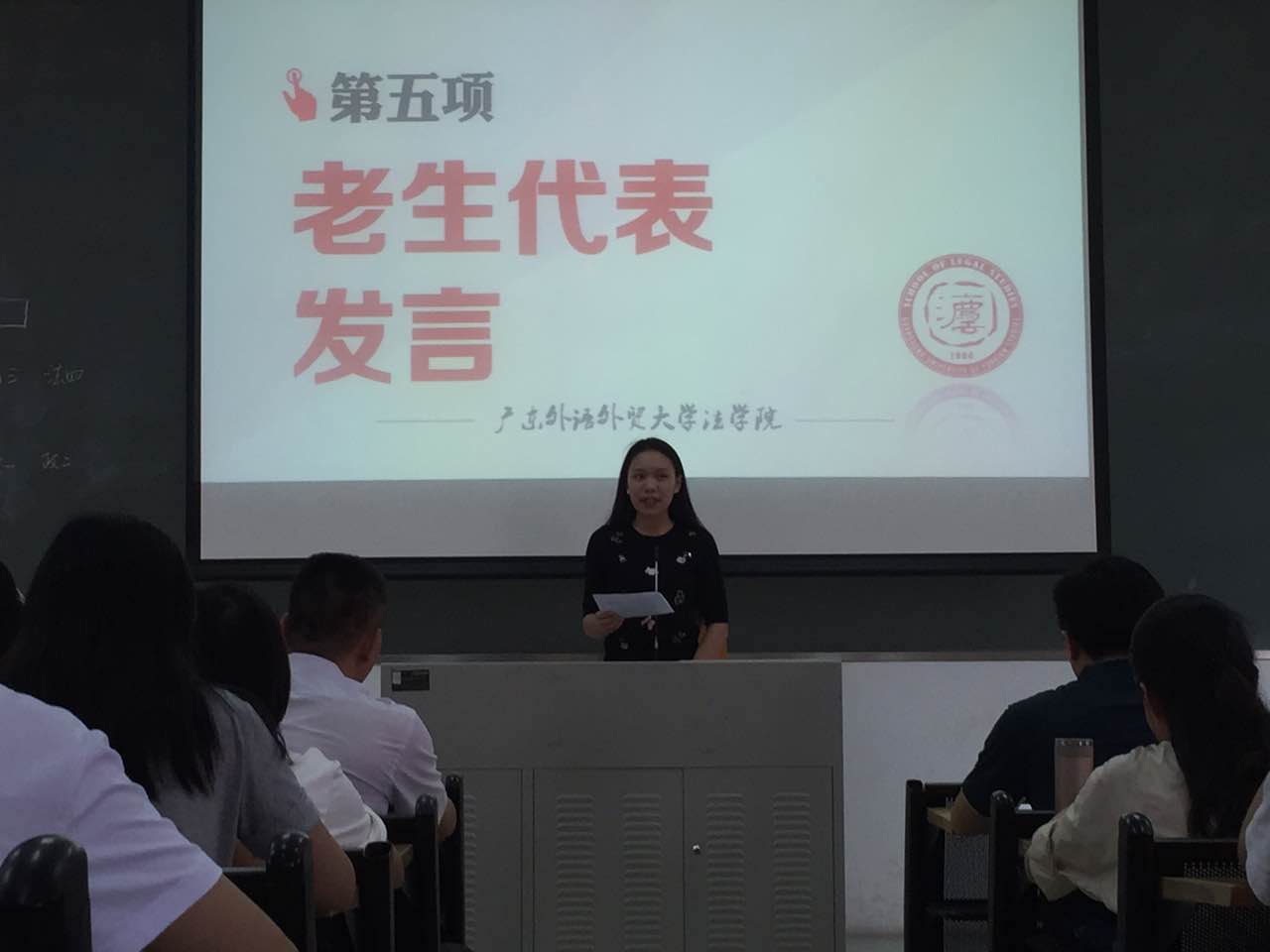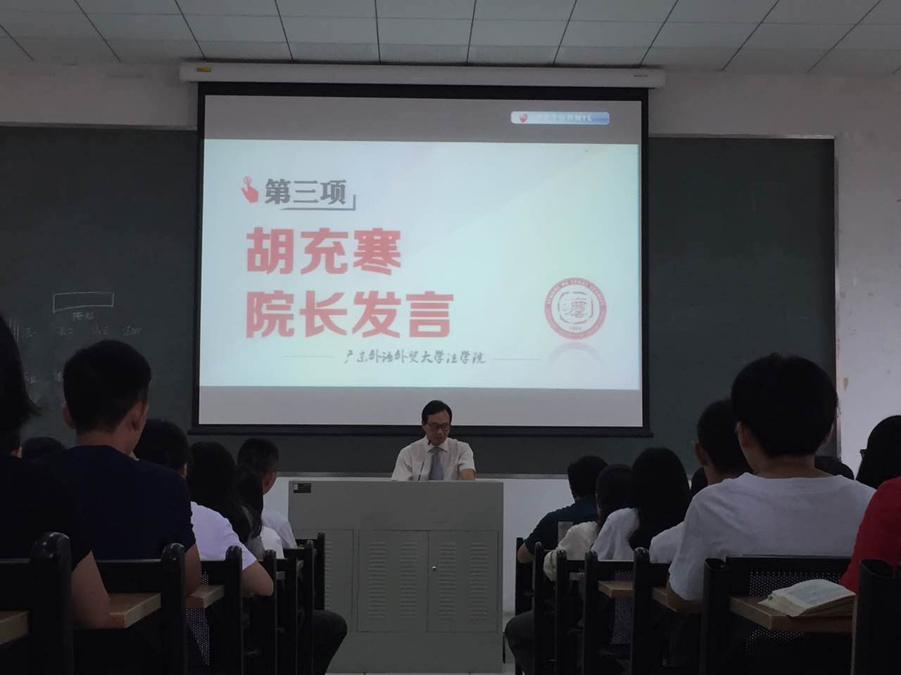 在全体奏唱国歌之后,胡充寒发表讲话。首先,他强调法律人是社会公共道德的捍卫者;其次,在大学,最重要的是要有健全良好的品格;紧接着,他通过与其他高校法学专业对比,总结出广外法学的特色:外语水平高,国际化特色鲜明,由此他建议同学们要加强外语学习,提升外语能力,追求综合全面发展;此外,他要求同学们要目光长远,不能将眼光局限在分数,要有家国情怀,联系国家与社会,“选择的不仅仅是一项专业,更是一项事业。”最后他表达了对员工的美好祝愿:从优秀到卓越,成为国家社会栋梁之材。之后,教师代表杨浩楠也进行了发言,分享了自己的教学经验。