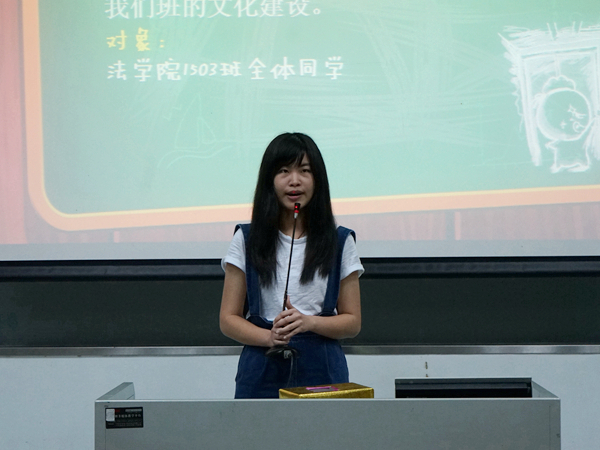 15级法四的团支书从支部简介、思想建设、特色活动以及展望未来四个方面向大家介绍了团支部近一年来的情况,一张张照片让大家感受到15法四的温暖。15法二以视频采访的形式道出了同学们对班级的看法,视频幽默搞笑,引发观众的阵阵笑声。在诙谐幽默的语言中,观众们体会到法四同学们对于班级的热爱。