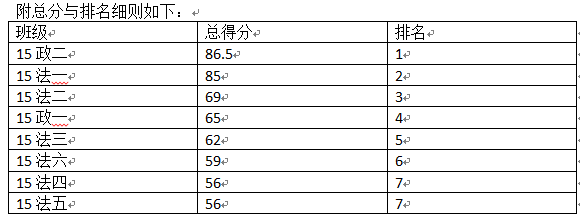 统分结束,最终得分由前期得分与现场得分两部分构成。15政二以总分86.5分名列本次评比的第一名,获得校级红旗团支部称号,15法一以总分85分位列第二,获得院级红旗团支部称号。