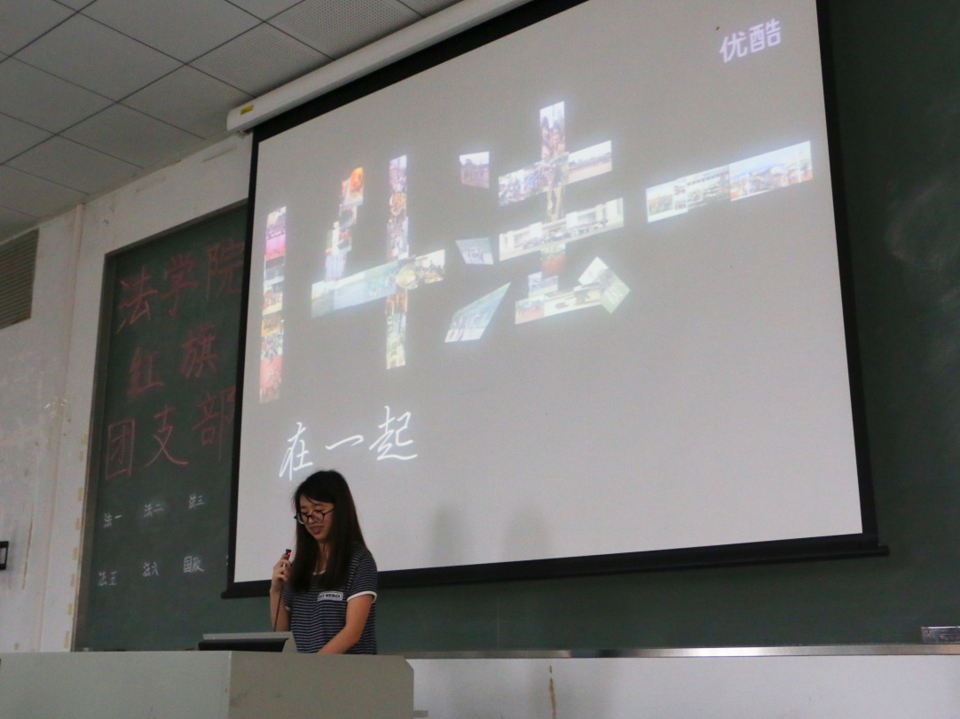 压轴登场的是14法一。伴随着视频播放,该班团支书对过去一年所举行的活动进行了总结。能文能武的法一,凭借巾帼不让须眉的舞蹈夺得了红晚的二等奖,在各项体育竞赛也屡有硕果。视频的最后,他们展示了拼接成了“14法一”字样的集体照。