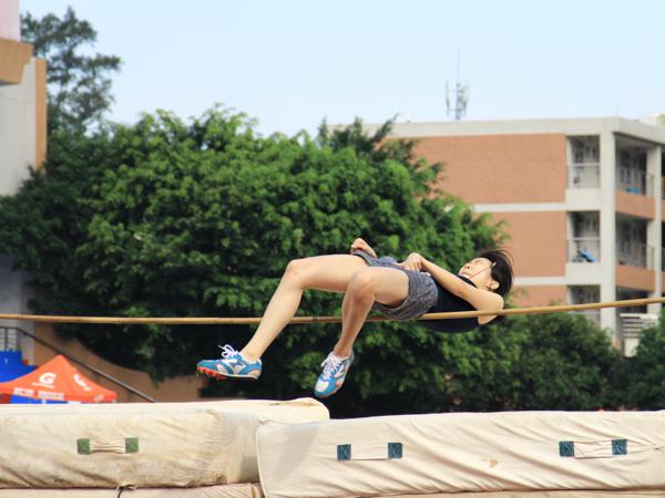 跳高是一项很挑战人的弹跳力和灵活性的运动。在女子组跳高中,运动员甄智贤给我们带来的一场精彩的赛事。一开始甄智贤便选择了1.1米的高,轻松跳过之后便“休养生息”,保存体力。第二次跳的高度为1.25米。她起步稳,跨步大,接近目的地便加速前进,然后轻松一跳,横杆丝毫没动,顺利过关。最后她以1.39米的佳绩夺得女子员工组跳高第二名。这位每年都参加比赛且获奖的大四师姐赛后表示,凡事要尽力,尽力就好。