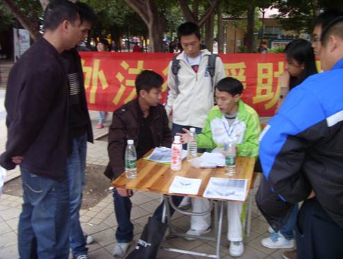 下午4:30讲座结束后,接着法援志愿者来到元岗街的广场进行现场普法。在简单的现场布置后,志愿者们分工合作,一组在广场四周派发普法传单、普法小册子,另一组则接受过往行人的法律咨询。