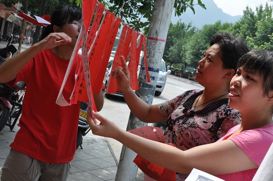 队员们将法律知识问答题写在红纸上以猜灯谜这一生动有趣的方式来进行普法活动。群众将要答题目的红纸撕下来后交给兑奖处的工作人员,工作人员将就相关题目进行详细的讲解,并为答对的群众赠送小礼品。这一环节新奇有趣,吸引了不少群众的围观,男女老少,络绎不绝,场面十分活跃。拿到奖品的,笑得合不拢嘴,没拿到的也表示因为能学到法律知识而感到满足。