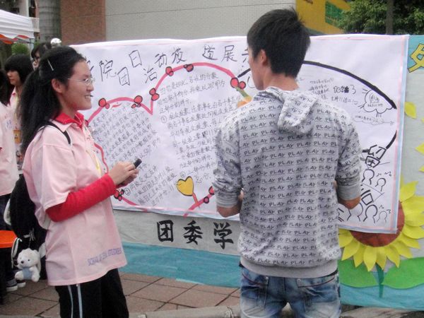 下午两点三十分,活动成果展正式拉开帷幕,各团支部在本支部的大本营以各种各样的形式吸引同学的注意,并热情地为前来咨询的观众做详细的解说,以增加观众对本支部团日活动内容的了解。