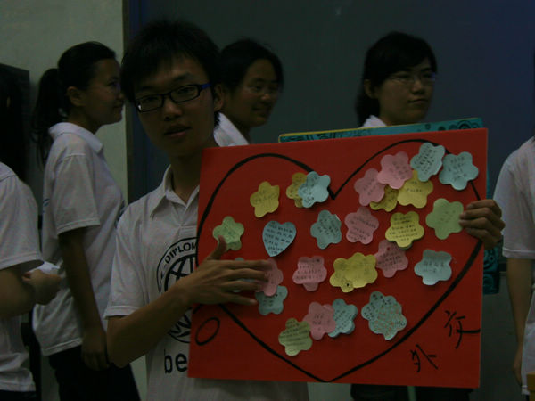 一曲《歌唱祖国》的大合唱燃烧了10法六的激情,赢得了在场阵阵的欢呼和掌声。“10外交,相亲相爱一家人”,是外交学子的口号,在《我们是一家人》音乐的伴奏下,他们轮流将写给班级的留言贴在了爱心纸板上,一个充满爱的团支部完整地呈现在观众面前。