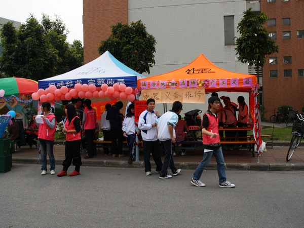 下午2点,“2011‘幸福广东·青年先锋’雷锋月服务一条街”系列活动进行了简单而隆重的剪彩开幕仪式,在所有摊位工作人员的热烈掌声中,活动正式拉开帷幕。“家电义修·服务你我”摊位坐落在四栋宿舍楼前的红木棉区,该帐篷上赫然贴着的“电器义务维修”金字和零星分布的红木棉花的图样,挂着的一长排红气球,帐篷腿上围着的闪闪发亮的彩带,整个摊位显得简单而美丽。