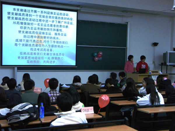 评比中,一枝独秀的08法四没有使用视频展示,而是通过团支书具体而微的讲述为观众展现他们的风采。在团支书的娓娓道来中,同学们了解了法四的支部构成、支部建设、班级学风建设、班级活动和亚运服务成果。他们丰富多彩的班级活动以及绽放活力的亚运服务活动,让这个团支部别具风采。