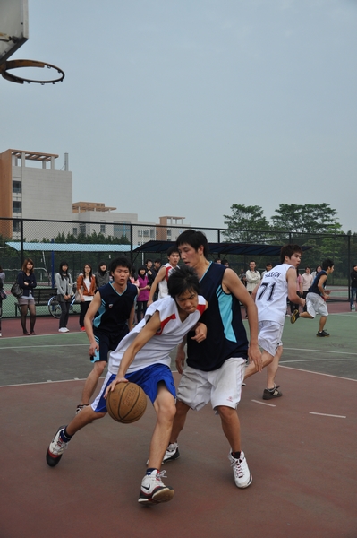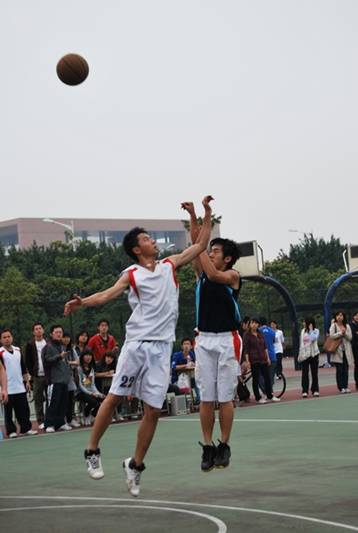 开场哨音一落,07法二迅即取得控球权,32号任相宇带球上篮,2分进账!08法五也不甘示弱,随即快攻反击,把比分追平。气势大增的08法五凭借队员间的默契配合和多变的战术拉大分差。但07法二根据08法五的战术特点,还以颜色,致使法五一度陷入得分荒。特别是07法二的8号黄志坚和5号张桐枫,屡屡快攻,为法二追平比分。场上十分激烈,而场外观众不时为球员们加油助威,不时为双方精准的投球大喊:“漂亮!”