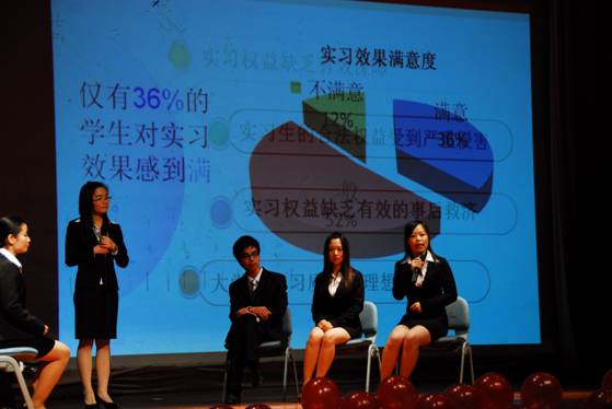本网讯(记者:文字:吴丹妍 摄影:方少杰) 2010年4月13日晚上7点,第四届“与法同行”调研大赛总决赛在南校区员工活动中心隆重举行。法公司党委副书记卢海清、团委书记郭嫄莅临现场,评委由范利平教授、朱晔教授、常廷彬副教授、修文辉老师及陈胜老师担任。5支决赛队伍本着务实求真的精神,对身边现存的现象进行了系统的研究与调查。