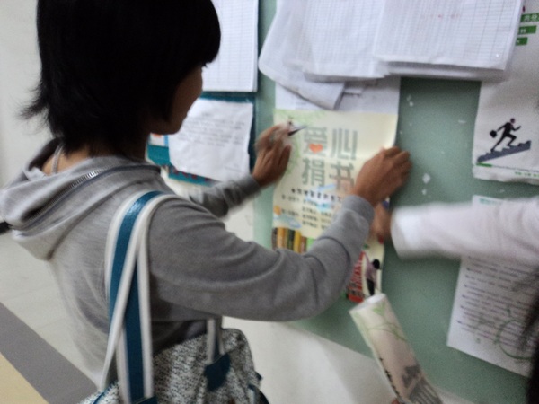 据了解,11月4日,生活纪律部就开始了本次活动的宣传。他们采取的形式多样的宣传方式:走访宿舍宣传、粘贴海报、派发捐书倡议书、到班宣传等等,如此大力宣传目的是让同学们能了解这次活动的意义,并积极地加入到活动当中。而参与了此次活动的干事朱晓庆则说:“我负责的是到09级师姐的宿舍宣传,她们大多数人都表示非常乐意奉献爱心,支持这项有意义的活动。
