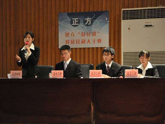 在激烈的自由辩环节,双方各持己见,对于反方死死揪住的居住权、发展权得不到保障、政府投入引起的浪费和歧视问题的不可避免性、对待贫民和社会其他群体的差别性问题上,正方以效仿香港和新加坡建立新型贫民窟的成功例子给予有力反驳,赢得了在场观众的多次掌声。