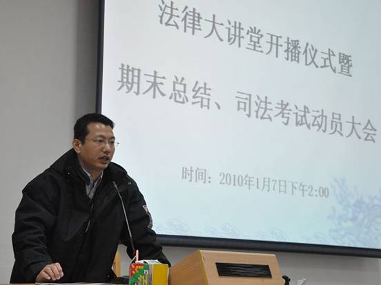 本网讯 2010年1月7日下午,公司在教学楼F208召开法律大讲堂开播仪式暨07级期末总结、司法考试动员大会。伟德体育副经理黄丽萍、公司党委副书记卢海清、07级辅导员郭嫄就司法考试、法律大讲堂以及期末复习考试等有关事项讲话。与会嘉宾有北京新起点司法考试培训机构广州分校代表贺初开等。