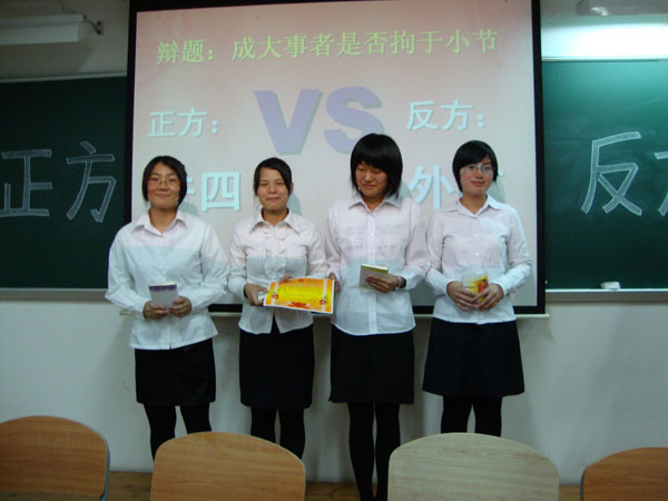 本网讯 11月15日晚,09法四与09外交进行了一场惊心动魄的辩论赛冠军争夺战。双方就“成大事应否拘小节”展开激烈争论,剑拔驽张,其激烈而紧张的气氛扣起观众心弦。最后,外交险胜法四,夺得本届新生杯辩论赛的冠军宝座。