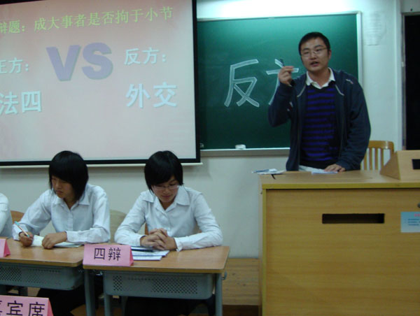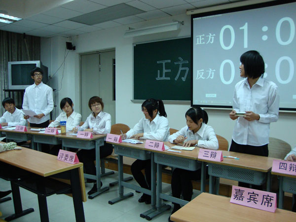 最后,主持人宣布,反方外交班获胜,“最佳辩手”称号也由外交班的曹慧同学获得。此外,在较早之前举行的桂军角逐中,法一得胜,法四的吴玙同学获得该场比赛“最佳辩手”称号。
