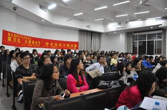 本网讯 12月9日晚上6:30,广外第五届学术节系列活动之伟德体育第四届“法眼看世界”学术风采大赛决赛在F315隆重拉开帷幕。进入决赛的共有9个小组,评委组成包括来自法学组的范利平、叶昌富老师及国政外交组的陈寒溪、黎家勇老师,出席的嘉宾有校团委副书记谢秀兰、法公司党委副书记卢海清及伟德体育团委书记郭嫄。