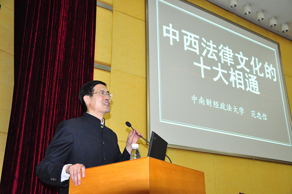 谈到法律文化,范教授解释道,法律文化是一个民族的政治章法样式或法律生活模式,它包括法律思维,法律规范,法律设施,法律技艺等。法律文化对中华民族的影响十分重大。 他指出了中西法律文化在“法自然和自然法”“民本主义和民主主义”“革命权与人民反抗权”“公利立法和公意立法”“法尊于君与法律之上”“仁道主义与人道主义”“重法治吏与依法控权”“科举制度与文官制度”“台谏制度与”等方面的10大共通之处。