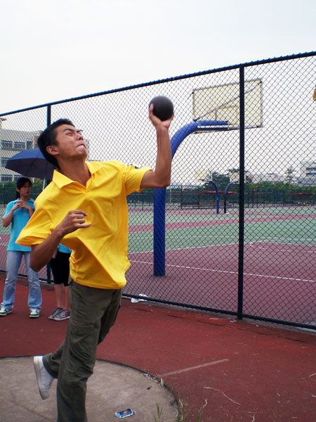 在男子铅球比赛中夺得冠军的是来自06国政的侯运男,8米73的成绩让他笑傲群雄,满怀雄心壮志的他在比赛结束后更誓言在一个月后的校运中努力为伟德体育争光。在女子组中,06法2的李晓燕以8米44的成绩将该此项目的冠军头衔纳入囊中!