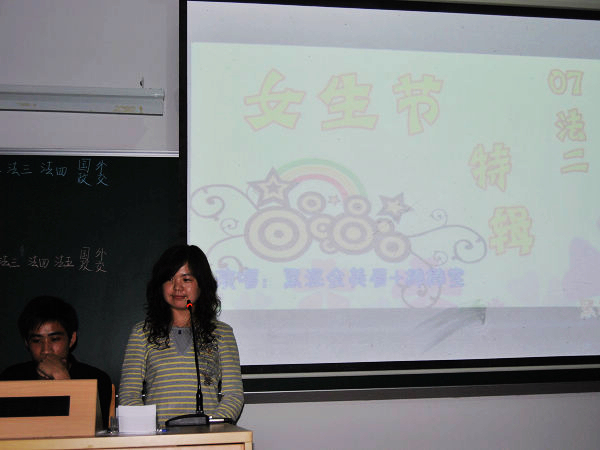 虽然没有07级的同学们在活动和制作视频上的经验丰富,但08级的同学对女生节活动的重视却也不亚于07级的师兄师姐们。他们主要采用了ppt和视频的两种形式展示了他们的关爱和快乐。08法五的同学一上场便已受到热烈的掌声和欢呼声,这位解说的同学一上场就操着怪里怪气的语调和诙谐的口吻向观众哗弄一番,接着又详尽地向观众们娓娓道来视频里的班会、送贺卡、女生宿舍布置气球等的短短故事。