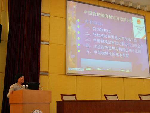 在听众热烈的掌声中,讲座拉开了帷幕。陈小君首先对物权的概念进行了阐释,她说,物指的一定是有形财产,物权的含义是有形财产的归属和支配的权利。接下来,陈小君用精彩生动的语言、深入浅出的讲解讲述了物权法的作用与意义。在阐述《物权法》的作用时,她引用大量的古谚今语并借用了时下的生活例子,通俗而精辟地归纳了物权法的两大作用:定分止争和物尽其用,并指出不动产是登记占有,而动产则是交付占有。